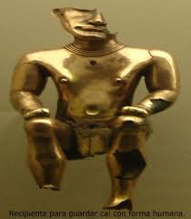 Quimbaya, cultura colombiana situada en el valle del río Cauca que se desarrolló entre el 200 y el 800 d.C., aunque el término quimbaya se utilizaba para designar a los indígenas que habitaban estas tierras a la llegada de los españoles. Asentados en una zona con clima templado y húmedo, muy apta para la agricultura, constituyeron una de las jefaturas más ricas y prósperas de los Andes septentrionales. Junto con otros pueblos de su entorno fueron los más grandes orfebres de la América prehispánica (véase Orfebrería precolombina). Utilizaron una gran variedad de técnicas: fundición en molde abierto, a la cera perdida, repujado, martillado y laminado, entre otras; con ellas realizaron todo tipo de objetos que luego fueron depositados como ofrendas en sus tumbas: cascos, narigueras, orejeras, collares, brazaletes, bastones de mando, alfileres y figuras antropomorfas y zoomorfas.